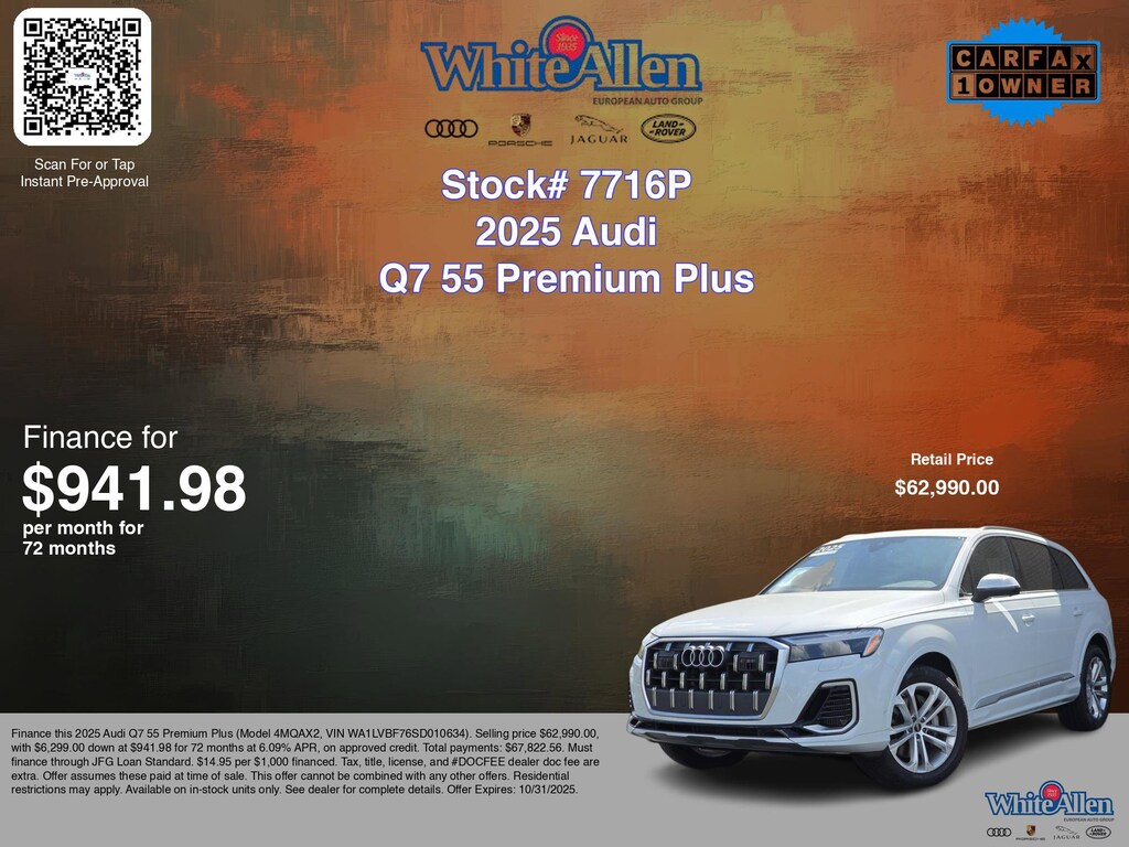 Disclaimer: Finance this 2025 Audi Q7 55 Premium Plus (Model 4MQAX2, VIN WA1LVBF76SD010634). Selling price $62,990.00, with $6,299.00 down at $941.98 for 72 months at 6.09% APR, on approved credit. Total payments: $67,822.56. Must finance through JFG Loan Standard. $14.95 per $1,000 financed. Tax, title, license, and #DOCFEE dealer doc fee are extra. Offer assumes these paid at time of sale. This offer cannot be combined with any other offers. Residential restrictions may apply. Available on in-stock units only. See dealer for complete details. Offer Expires: 10/31/2025.
