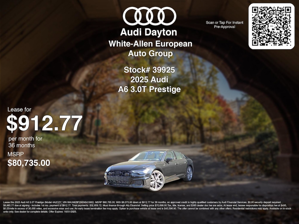 Disclaimer: Lease this 2025 Audi A6 3.0T Prestige (Model 4A2C2Y; VIN WAUM2BF29SN041682). MSRP $80,735.00. With $8,073.00 down at $912.77 for 36 months, on approved credit to highly qualified customers by Audi Financial Services. $0.00 security deposit required. $8,985.77 due at signing - includes 1st mo. payment of $912.77. Total payments: $32,859.72. Must finance through Ally Financial. Selling price $70,698.00.Tax, title, license, and $395 dealer doc fee are extra. At lease end, lessee responsible for disposition fee of $495, $0.25/mile in excess of 30,000 miles, and excessive wear and use. An early lease termination fee may apply. Option to purchase vehicle at lease end is $43,596.90. The offer cannot be combined with any other offers. Residential restrictions may apply. Available on in-stock units only. See dealer for complete details. Offer Expires: 10/31/2025.