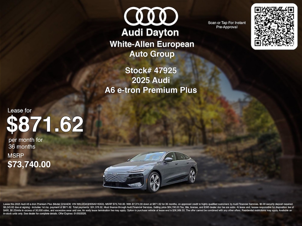 If you're ready to lease a new Audi vehicle near Dayton, Kettering, Beavercreek, and Fairborn, White Allen Audi of Dayton is thrilled to offer you a competitive lease offer on this 2025 Audi A6 e-tron Premium Plus. Hereâs how the monthly payment of $871.62 is calculated for well qualified buyers shopping White Allen Audi of Dayton with Tier 1 credit: