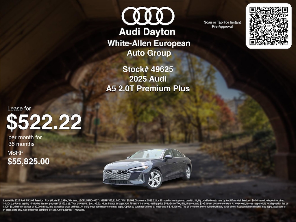 If you're ready to lease a new Audi vehicle near Dayton, Kettering, Beavercreek, and Fairborn, White Allen Audi of Dayton is thrilled to offer you a competitive lease offer on this 2025 Audi A5 2.0T Premium Plus. Hereâs how the monthly payment of $522.22 is calculated for well qualified buyers shopping White Allen Audi of Dayton with Tier 1 credit: