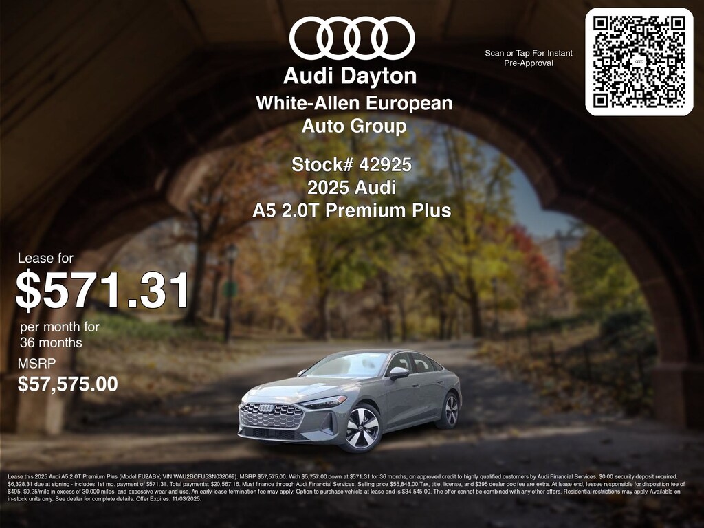 Disclaimer: Lease this 2025 Audi A5 2.0T Premium Plus (Model FU2ABY; VIN WAU2BCFU5SN032069). MSRP $57,575.00. With $5,757.00 down at $571.31 for 36 months, on approved credit to highly qualified customers by Audi Financial Services. $0.00 security deposit required. $6,328.31 due at signing - includes 1st mo. payment of $571.31. Total payments: $20,567.16. Must finance through Audi Financial Services. Selling price $55,848.00.Tax, title, license, and $395 dealer doc fee are extra. At lease end, lessee responsible for disposition fee of $495, $0.25/mile in excess of 30,000 miles, and excessive wear and use. An early lease termination fee may apply. Option to purchase vehicle at lease end is $34,545.00. The offer cannot be combined with any other offers. Residential restrictions may apply. Available on in-stock units only. See dealer for complete details. Offer Expires: 11/03/2025.