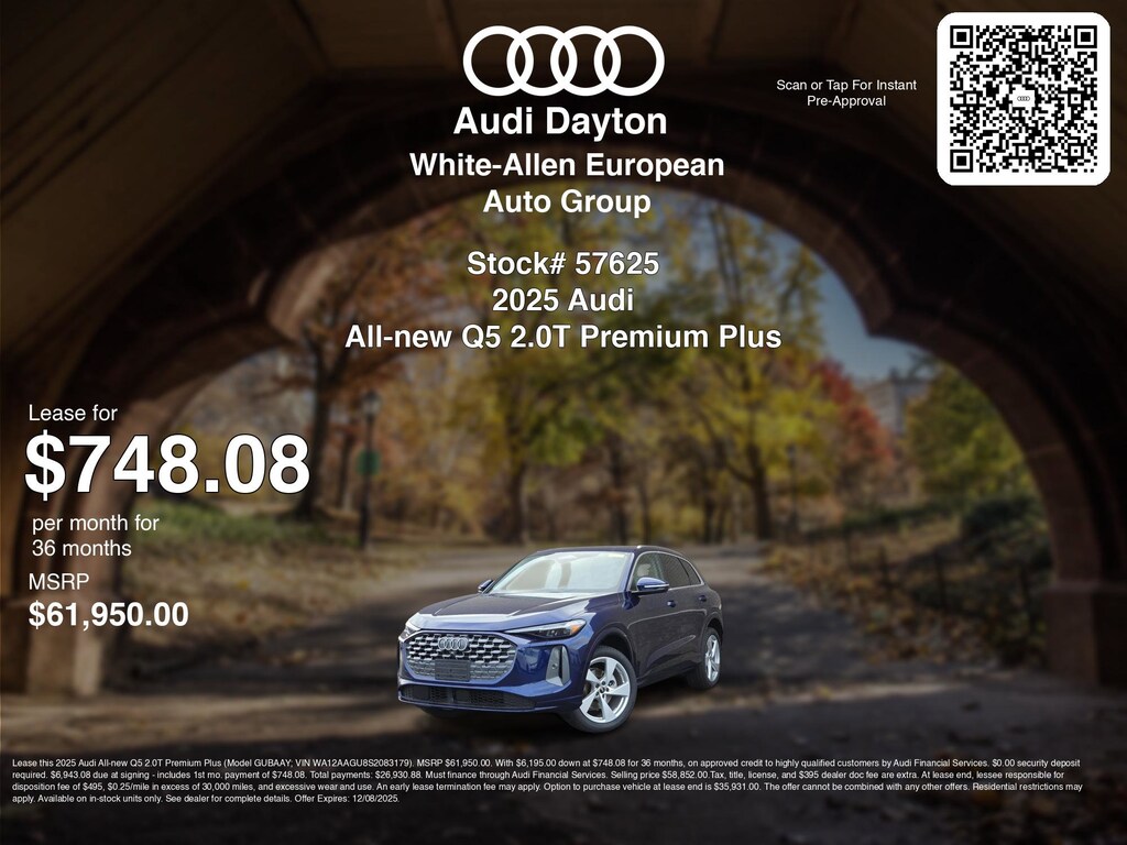 Disclaimer: Lease this 2025 Audi All-new Q5 2.0T Premium Plus (Model GUBAAY; VIN WA12AAGU8S2083179). MSRP $61,950.00. With $6,195.00 down at $748.08 for 36 months, on approved credit to highly qualified customers by Audi Financial Services. $0.00 security deposit required. $6,943.08 due at signing - includes 1st mo. payment of $748.08. Total payments: $26,930.88. Must finance through Audi Financial Services. Selling price $58,852.00.Tax, title, license, and $395 dealer doc fee are extra. At lease end, lessee responsible for disposition fee of $495, $0.25/mile in excess of 30,000 miles, and excessive wear and use. An early lease termination fee may apply. Option to purchase vehicle at lease end is $35,931.00. The offer cannot be combined with any other offers. Residential restrictions may apply. Available on in-stock units only. See dealer for complete details. Offer Expires: 12/08/2025.