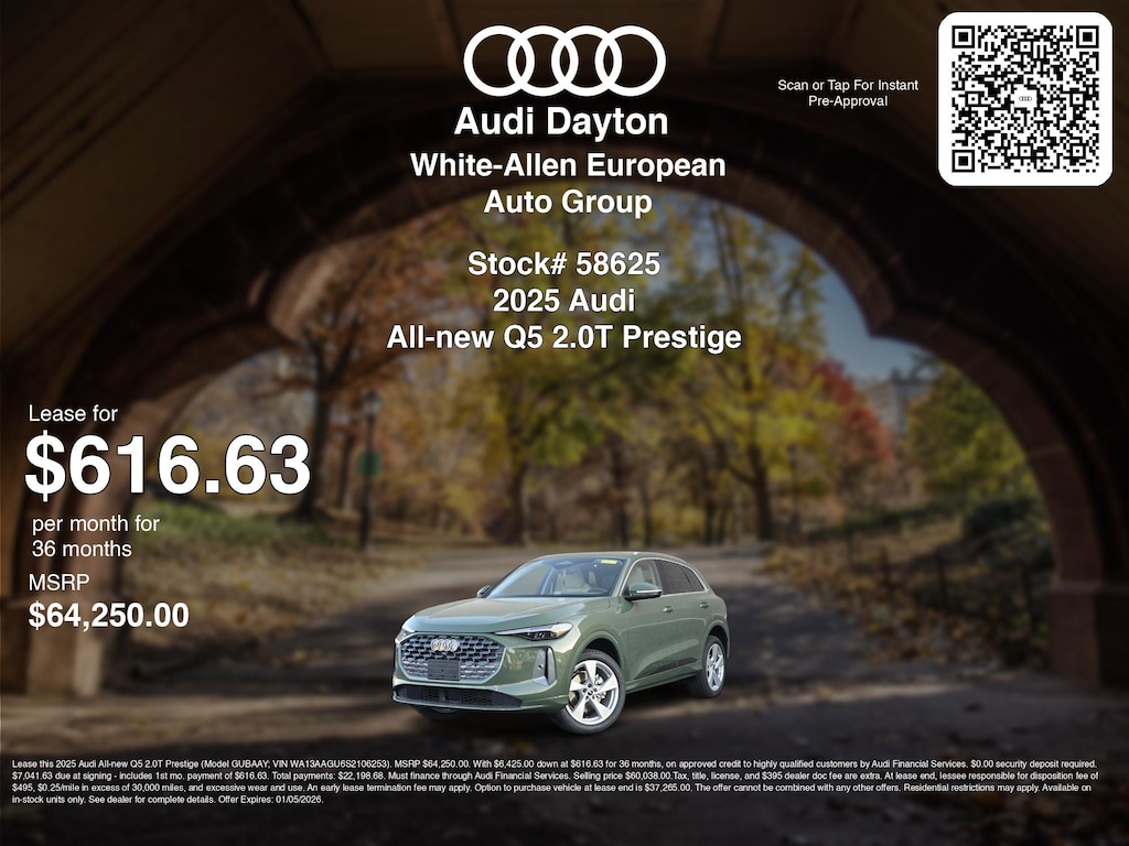 Disclaimer: Lease this 2025 Audi All-new Q5 2.0T Prestige (Model GUBAAY; VIN WA13AAGU6S2106253). MSRP $64,250.00. With $6,425.00 down at $616.63 for 36 months, on approved credit to highly qualified customers by Audi Financial Services. $0.00 security deposit required. $7,041.63 due at signing - includes 1st mo. payment of $616.63. Total payments: $22,198.68. Must finance through Audi Financial Services. Selling price $60,038.00.Tax, title, license, and $395 dealer doc fee are extra. At lease end, lessee responsible for disposition fee of $495, $0.25/mile in excess of 30,000 miles, and excessive wear and use. An early lease termination fee may apply. Option to purchase vehicle at lease end is $37,265.00. The offer cannot be combined with any other offers. Residential restrictions may apply. Available on in-stock units only. See dealer for complete details. Offer Expires: 01/05/2026.
