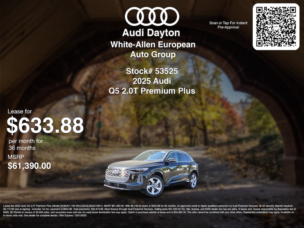 If you're ready to lease a new Audi vehicle near Dayton, Kettering, Beavercreek, and Fairborn, White Allen Audi of Dayton is thrilled to offer you a competitive lease offer on this 2025 Audi Q5 2.0T Premium Plus. Hereâs how the monthly payment of $633.88 is calculated for well qualified buyers shopping White Allen Audi of Dayton with Tier 1 credit: