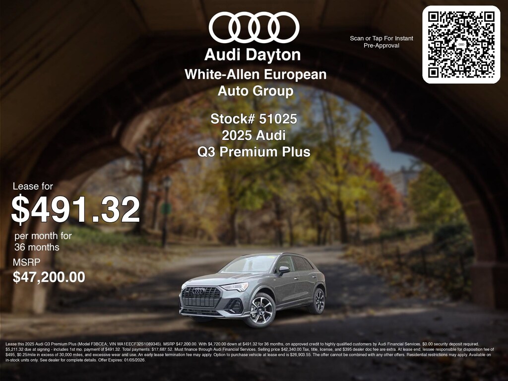 If you're ready to lease a new Audi vehicle near Dayton, Kettering, Beavercreek, and Fairborn, White Allen Audi of Dayton is thrilled to offer you a competitive lease offer on this 2025 Audi Q3 Premium Plus. Hereâs how the monthly payment of $491.32 is calculated for well qualified buyers shopping White Allen Audi of Dayton with Tier 1 credit: