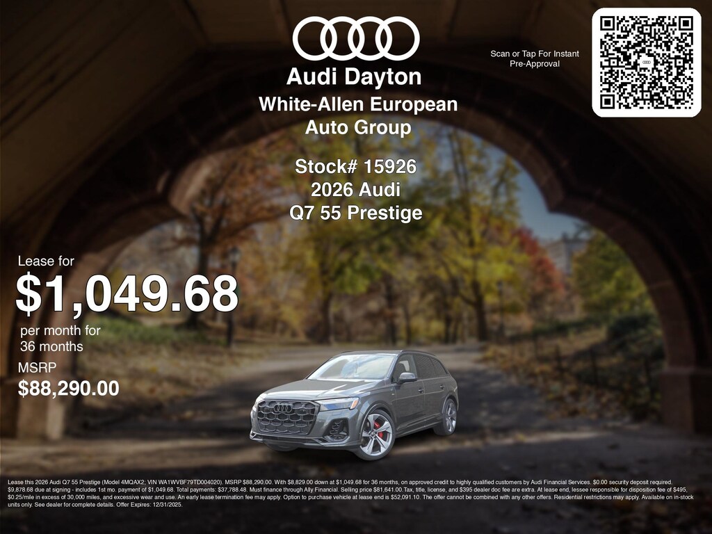Disclaimer: Lease this 2026 Audi Q7 55 Prestige (Model 4MQAX2; VIN WA1WVBF79TD004020). MSRP $88,290.00. With $8,829.00 down at $1,049.68 for 36 months, on approved credit to highly qualified customers by Audi Financial Services. $0.00 security deposit required. $9,878.68 due at signing - includes 1st mo. payment of $1,049.68. Total payments: $37,788.48. Must finance through Ally Financial. Selling price $81,641.00.Tax, title, license, and $395 dealer doc fee are extra. At lease end, lessee responsible for disposition fee of $495, $0.25/mile in excess of 30,000 miles, and excessive wear and use. An early lease termination fee may apply. Option to purchase vehicle at lease end is $52,091.10. The offer cannot be combined with any other offers. Residential restrictions may apply. Available on in-stock units only. See dealer for complete details. Offer Expires: 12/31/2025.