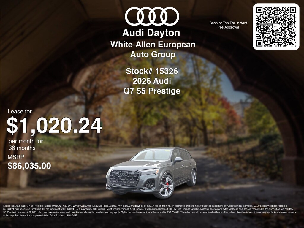 Disclaimer: Lease this 2026 Audi Q7 55 Prestige (Model 4MQAX2; VIN WA1WVBF7XTD004012). MSRP $86,035.00. With $8,603.00 down at $1,020.24 for 36 months, on approved credit to highly qualified customers by Audi Financial Services. $0.00 security deposit required. $9,623.24 due at signing - includes 1st mo. payment of $1,020.24. Total payments: $36,728.64. Must finance through Ally Financial. Selling price $79,454.00.Tax, title, license, and $395 dealer doc fee are extra. At lease end, lessee responsible for disposition fee of $495, $0.25/mile in excess of 30,000 miles, and excessive wear and use. An early lease termination fee may apply. Option to purchase vehicle at lease end is $50,760.65. The offer cannot be combined with any other offers. Residential restrictions may apply. Available on in-stock units only. See dealer for complete details. Offer Expires: 12/31/2025.