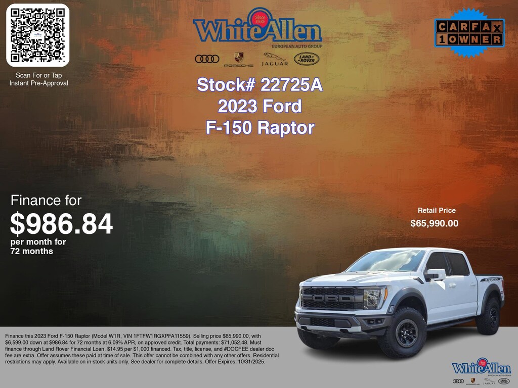 Disclaimer: Finance this 2023 Ford F-150 Raptor (Model W1R, VIN 1FTFW1RGXPFA11559). Selling price $65,990.00, with $6,599.00 down at $986.84 for 72 months at 6.09% APR, on approved credit. Total payments: $71,052.48. Must finance through Land Rover Financial Loan. $14.95 per $1,000 financed. Tax, title, license, and #DOCFEE dealer doc fee are extra. Offer assumes these paid at time of sale. This offer cannot be combined with any other offers. Residential restrictions may apply. Available on in-stock units only. See dealer for complete details. Offer Expires: 10/31/2025.