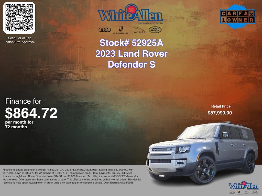 Disclaimer: Finance this 2023 Defender S (Model AK663/351CA, VIN SALEJFEUXP2232968). Selling price $57,990.00, with $5,799.00 down at $864.72 for 72 months at 5.99% APR, on approved credit. Total payments: $62,259.84. Must finance through Land Rover Financial Loan. $14.91 per $1,000 financed. Tax, title, license, and #DOCFEE dealer doc fee are extra. Offer assumes these paid at time of sale. This offer cannot be combined with any other offers. Residential restrictions may apply. Available on in-stock units only. See dealer for complete details. Offer Expires: 01/02/2026.
